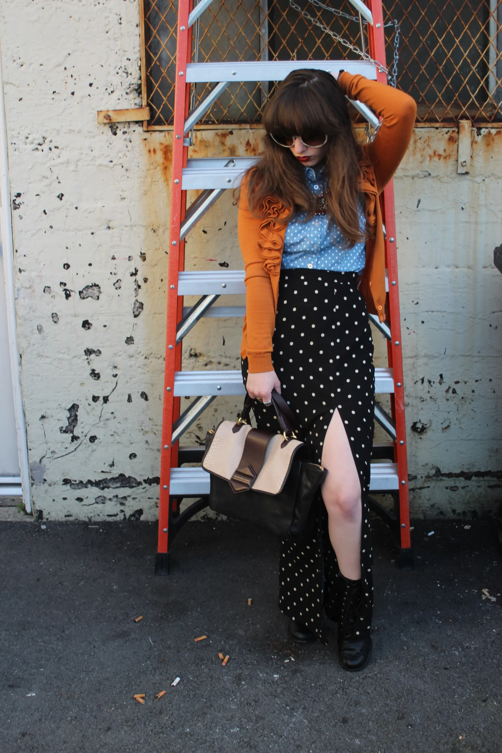 I really love the details of this look. The mix of polka dots is true to my tendency to clash patterns. I then use my ruffled cardigan add an extra pop to the whole look. The beaded necklace and two-faced watch are simply used to tie everything together. Obviously, this slitted maxi is still my favorite aspect of the whole look.